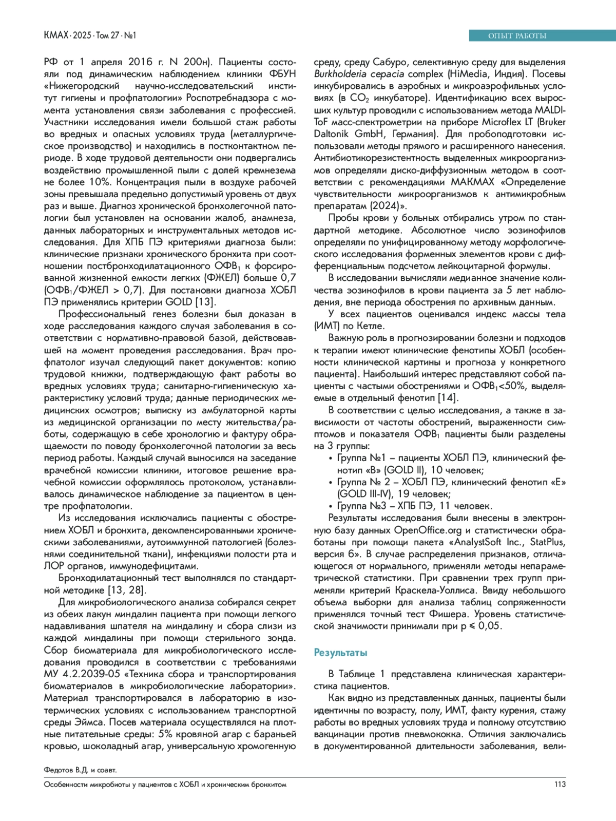 Материалы и методы. В зависимости от частоты обострений и показателя спирометрии пациенты были разделены на 3 группы: клинический фенотип «В» (ХОБЛ ПЭ, GOLD II) – 10 человек; клинический фенотип «Е» (ХОБЛ ПЭ, GOLD III-IV) – 19 человек; ХПБ ПЭ – 11 человек. В соответствии с методическими указаниями осуществлялся забор слизи из лакун миндалин, далее биоматериал транспортировался в лабораторию в изотермических условиях с использованием транспортной среды Эймса. Посев осуществлялся на плотные питательные среды, которые инкубировались в аэробных и микроаэрофильных условиях. Идентификацию выросших культур проводили с использованием метода MALDI-ToF масс-спектрометрии. Антибиотикорезистеность выделенных микроорганизмов определяли диско-диффузионным методом в соответствии с актуальной версией рекомендаций МАКМАХ.