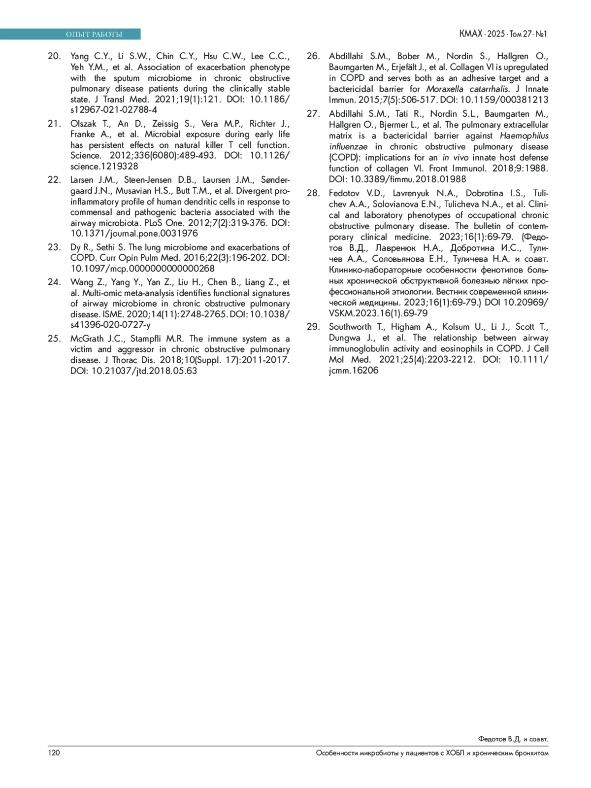 6. Федотов В.Д., Жестков А.В., Лямин А.В., Заславская М.И., Добротина И.С., Туличев А.А. Микробиом, обострение и прогрессирование ХОБЛ: есть ли выход? Клиническая микробиология и антимикробная химиотерапия. 2022;24(3):202-212. DOI: 10.36488/cmac.2022.3.202-212