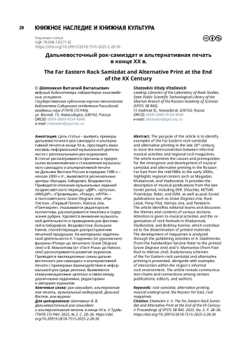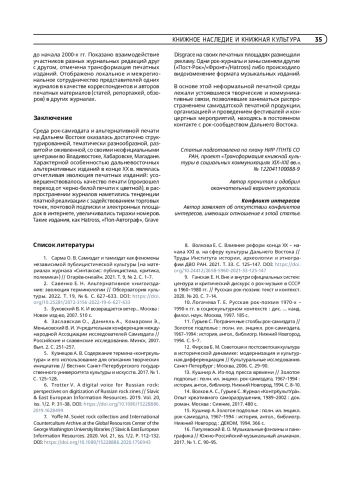 6. Trotter V. A digital voice for Russian rock: perspectives on digitization of Russian rock zines // Slavic & East European Information Resources. 2019. Vol. 20, iss. 1/2. P. 31-38. https://doi.org/10.1080/15228886.2019.1628499