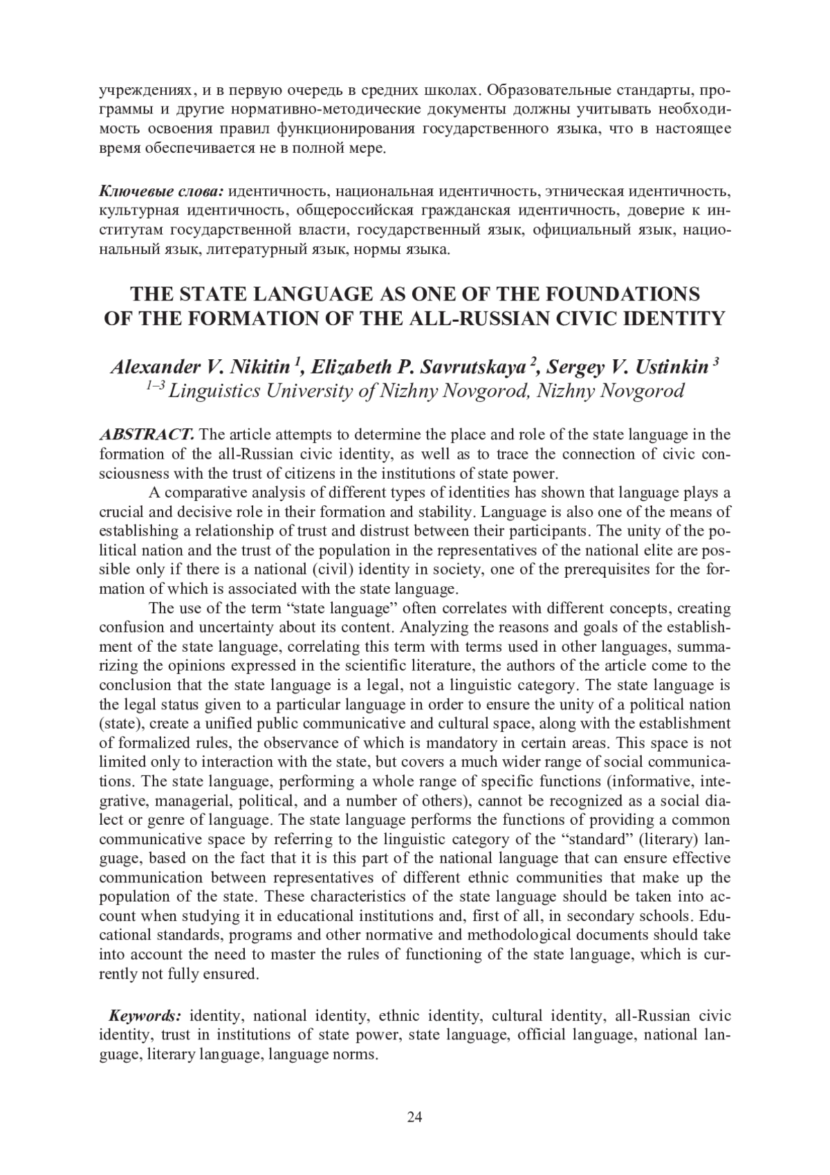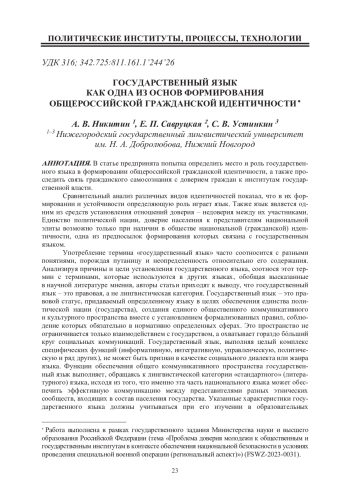 В статье предпринята попытка определить место и роль государственного языка в формировании общероссийской гражданской идентичности, а также проследить связь гражданского самосознания с доверием граждан к институтам государственной власти. Сравнительный анализ различных видов идентичностей показал, что в их формировании и устойчивости определяющую роль играет язык. Также язык является одним из средств установления отношений доверия - недоверия между их участниками. Единство политической нации, доверие населения к представителям национальной элиты возможно только при наличии в обществе национальной (гражданской) идентичности, одна из предпосылок формирования которых связана с государственным языком. Употребление термина «государственный язык» часто соотносится с разными понятиями, порождая путаницу и неопределенность относительно его содержания. Анализируя причины и цели установления государственного языка, соотнося этот термин с терминами, которые используются в других языках, обобщая высказанные в научной литературе мнения, авторы статьи приходят к выводу, что государственный язык - это правовая, а не лингвистическая категория. Государственный язык - это правовой статус, придаваемый определенному языку в целях обеспечения единства политической нации (государства), создания единого общественного коммуникативного и культурного пространства вместе с установлением формализованных правил, соблюдение которых обязательно в нормативно определенных сферах. Это пространство не ограничивается только взаимодействием с государством, а охватывает гораздо бóльший круг социальных коммуникаций. Государственный язык, выполняя целый комплекс специфических функций (информативную, интегративную, управленческую, политическую и ряд других), не может быть признан в качестве социального диалекта или жанра языка. Функции обеспечения общего коммуникативного пространства государственный язык выполняет, обращаясь к лингвистической категории «стандартного» (литературного) языка, исходя из того, что именно эта часть национального языка может обеспечить эффективную коммуникацию между представителями разных этнических сообществ, входящих в состав населения государства. Указанные характеристики государственного языка должны учитываться при его изучении в образовательных учреждениях, и в первую очередь в средних школах. Образовательные стандарты, программы и другие нормативно-методические документы должны учитывать необходимость освоения правил функционирования государственного языка, что в настоящее время обеспечивается не в полной мере.