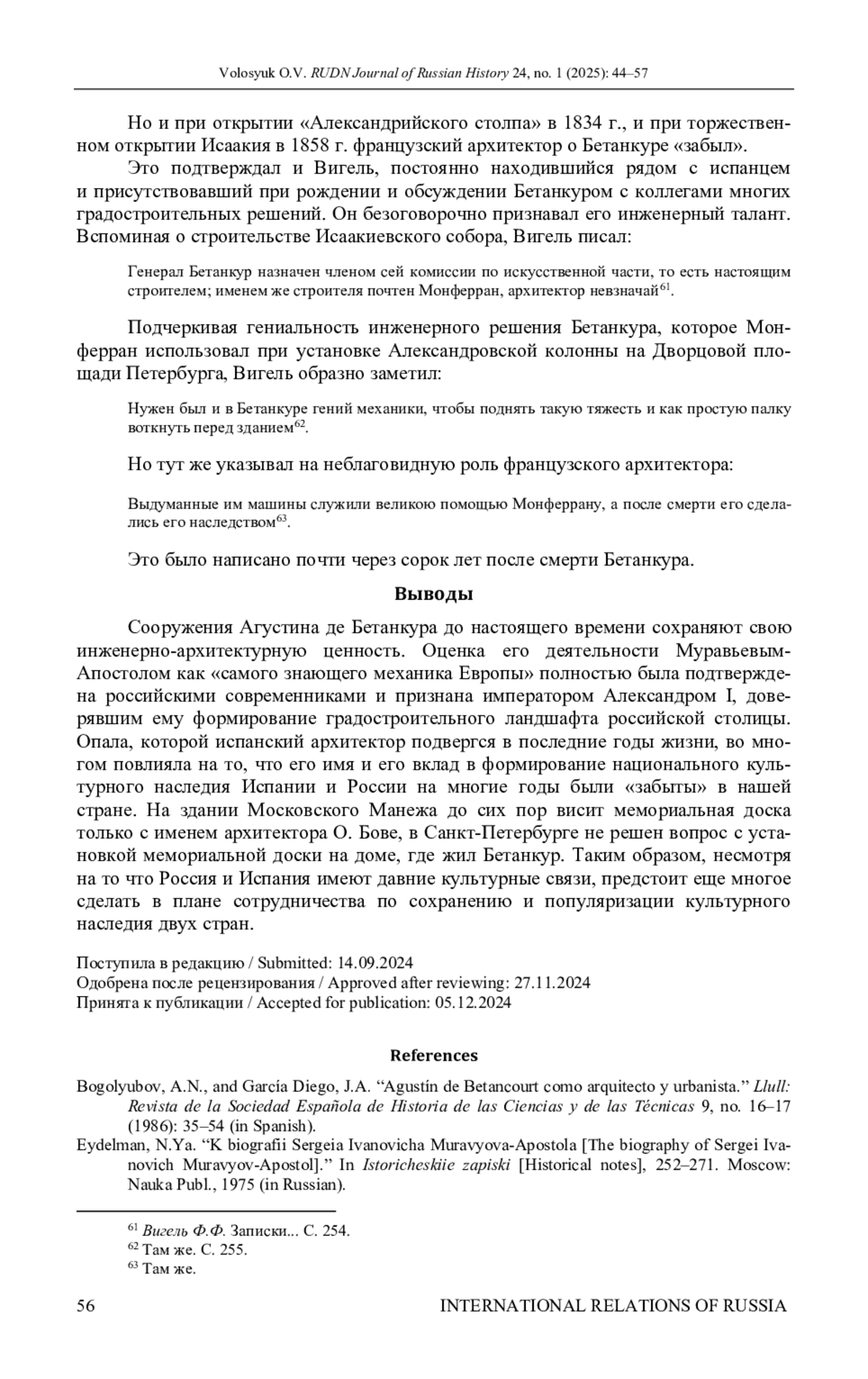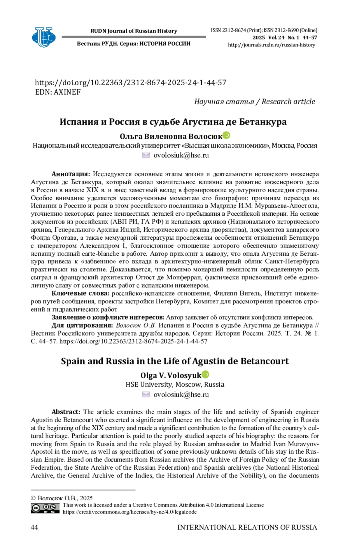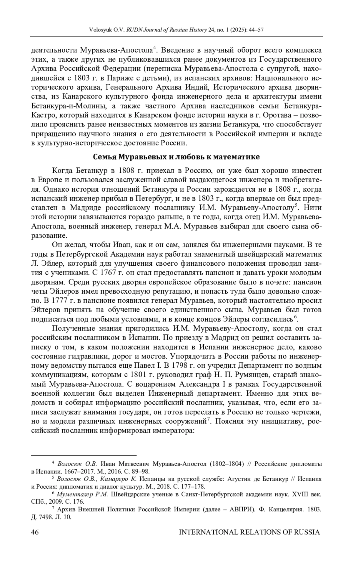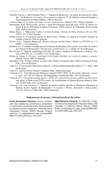 Исследуются основные этапы жизни и деятельности испанского инженера Агустина де Бетанкура, который оказал значительное влияние на развитие инженерного дела в России в начале XIX в. и внес заметный вклад в формирование культурного наследия страны. Особое внимание уделяется малоизученным моментам его биографии: причинам переезда из Испании в Россию и роли в этом российского посланника в Мадриде И. М. Муравьева-Апостола, уточнению некоторых ранее неизвестных деталей его пребывания в Российской империи. На основе документов из российских (АВП РИ, ГА РФ) и испанских архивов (Национального исторического архива, Генерального Архива Индий, Исторического архива дворянства), документов канарского Фонда Оротава, а также мемуарной литературы прослежены особенности отношений Бетанкура с императором Александром I, благосклонное отношение которого обеспечило знаменитому испанцу полный carte-blanche в работе. Автор приходит к выводу, что опала Агустина де Бетанкура привела к «забвению» его вклада в архитектурно-инженерный облик Санкт-Петербурга практически на столетие. Доказывается, что помимо монаршей немилости определенную роль сыграл и французский архитектор Огюст де Монферран, фактически присвоивший себе единоличную славу от совместных работ с испанским инженером.