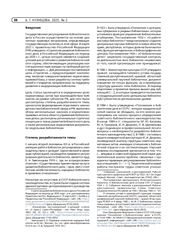 18. Домбровская И. В., Кузнецова А. Г. Проблемы и задачи нормативного обеспечения деятельности в современной библиотеке // Вестник Дальневосточной государственной научной библиотеки. 2023. № 1. С. 122-134.