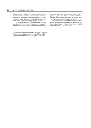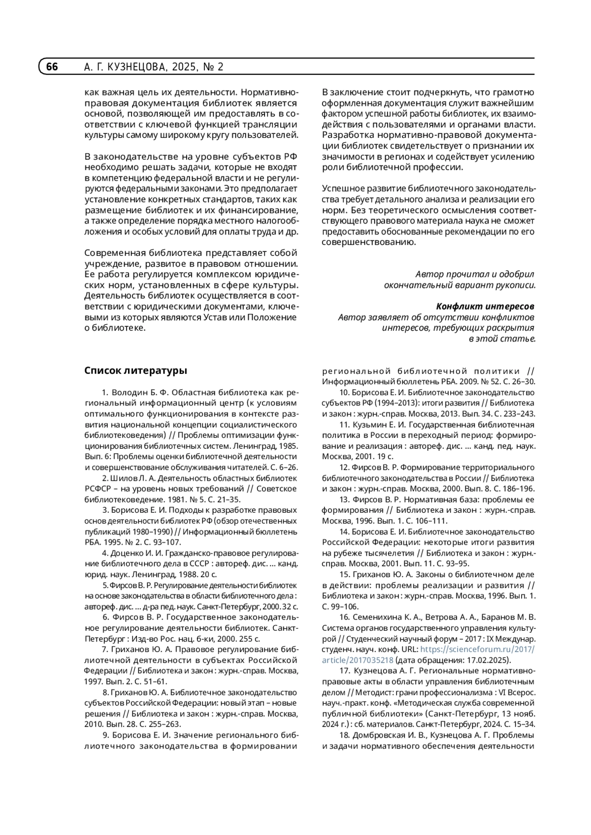 17. Кузнецова А. Г. Региональные нормативноправовые акты в области управления библиотечным делом // Методист: грани профессионализма : VI Всерос. науч.-практ. конф. «Методическая служба современной публичной библиотеки» (Санкт-Петербург, 13 нояб. 2024 г.) : сб. материалов. Санкт-Петербург, 2024. С. 15-34.