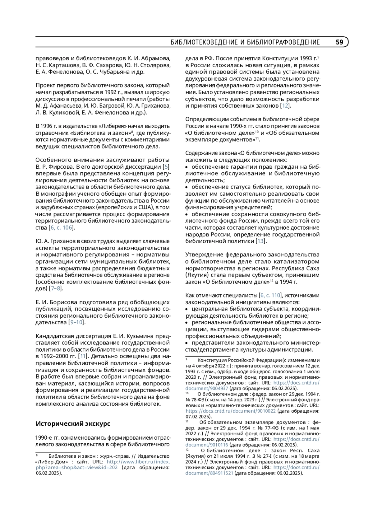 10. Борисова Е. И. Библиотечное законодательство субъектов РФ (1994-2013): итоги развития // Библиотека и закон : журн.-справ. Москва, 2013. Вып. 34. С. 233-243.