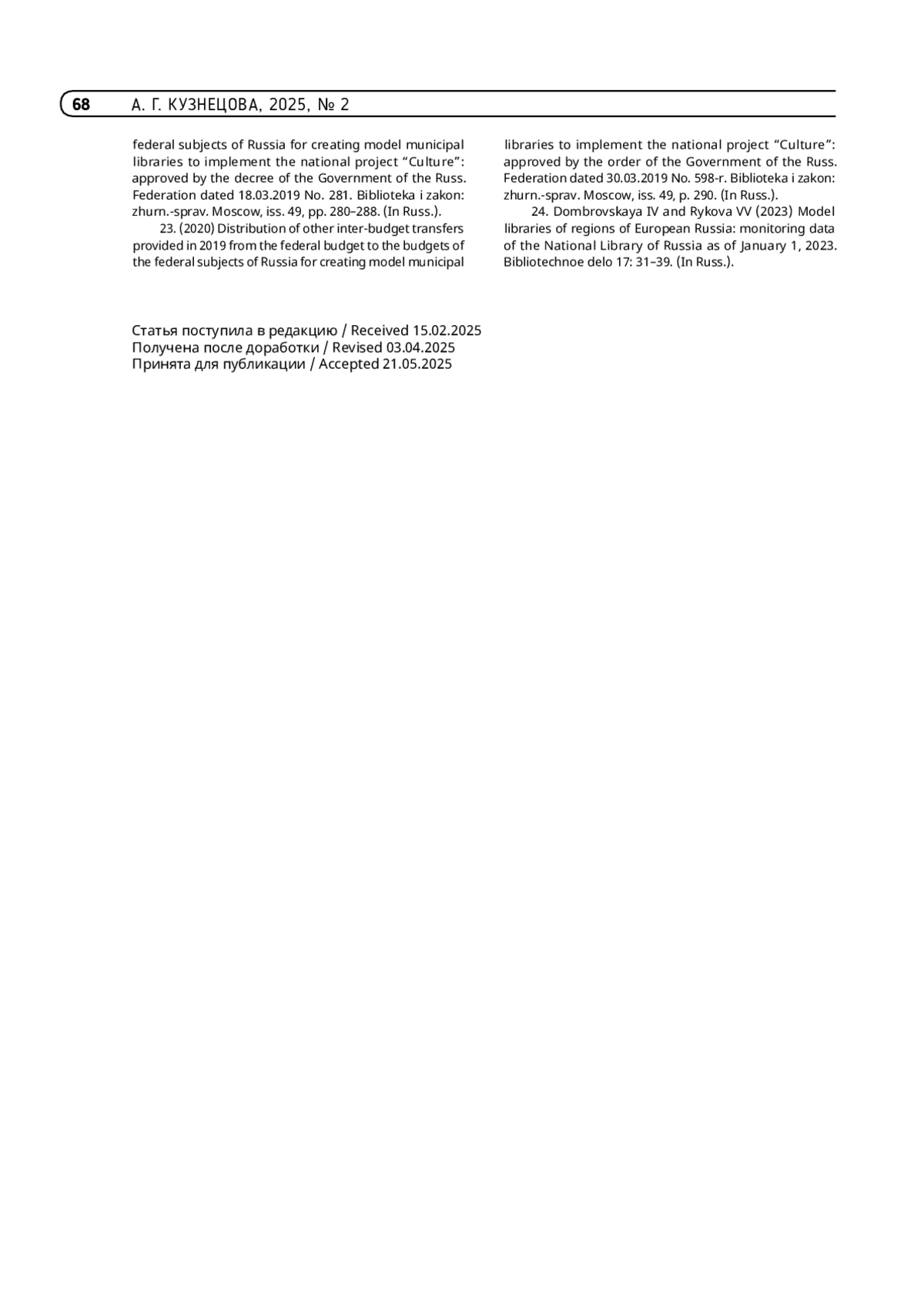 24. Домбровская И. В., Рыкова В. В. Модельные библиотеки регионов Европейской части России: данные мониторинга РНБ на 01 января 2023 г. // Библиотечное дело. 2023. № 17. С. 31-39.