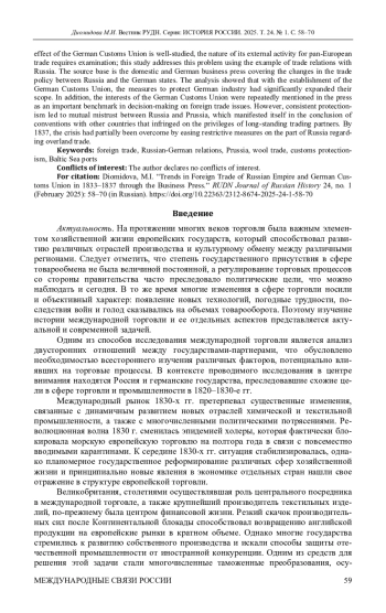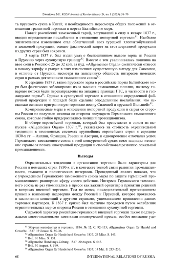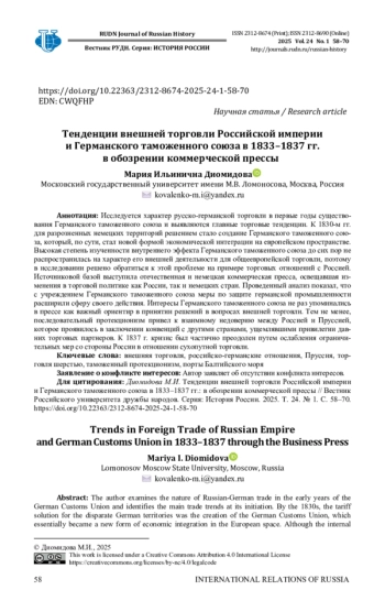 Исследуется характер русско-германской торговли в первые годы существования Германского таможенного союза и выявляются главные торговые тенденции. К 1830-м гг. для разрозненных немецких территорий решением стало создание Германского таможенного союза, который, по сути, стал новой формой экономической интеграции на европейском пространстве. Высокая степень изученности внутреннего эффекта Германского таможенного союза до сих пор не распространилась на характер его внешней деятельности для общеевропейской торговли, поэтому в исследовании решено обратиться к этой проблеме на примере торговых отношений с Россией. Источниковой базой выступила отечественная и немецкая коммерческая пресса, освещавшая изменения в торговой политике как России, так и немецких стран. Проведенный анализ показал, что с учреждением Германского таможенного союза меры по защите германской промышленности расширили сферу своего действия. Интересы Германского таможенного союза не раз упоминались в прессе как важный ориентир в принятии решений в вопросах внешней торговли. Тем не менее, последовательный протекционизм привел к взаимному недоверию между Россией и Пруссией, которое проявилось в заключении конвенций с другими странами, ущемлявшими привилегии давних торговых партнеров. К 1837 г. кризис был частично преодолен путем ослабления ограничительных мер со стороны России в отношении сухопутной торговли.