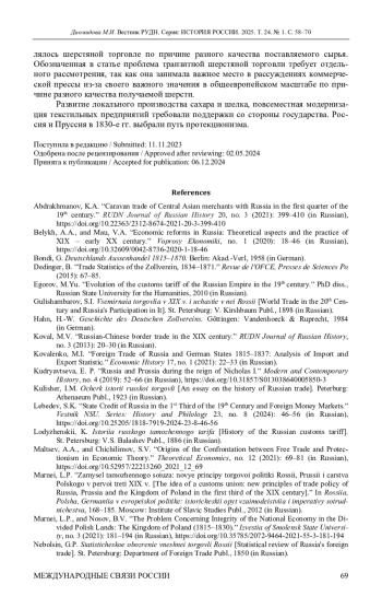 1. Абдрахманов К.А. Караванная торговля среднеазиатских купцов с Россией в первой четверти XIX в. // Вестник Российского университета дружбы народов. Серия: История России. 2021. Т. 20. № 3. C. 399-410. DOI: 10.22363/2312-8674-2021-20-3-399-410 EDN: QFWKNJ