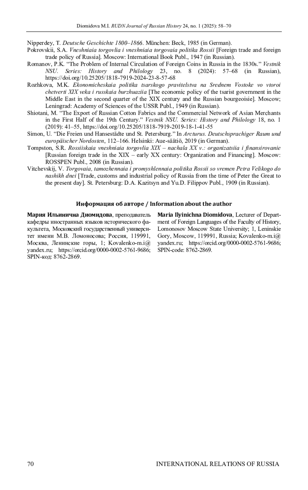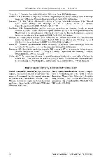 24. Shiotani M. The Export of Russian Cotton Fabrics and the Commercial Network of Asian Merchants in the First Half of the 19th Century // Vestnik NSU. Series: History and Philology. 2019. № 18. P. 41-55. DOI: 10.25205/1818-7919-2019-18-1-41-55 EDN: YZTVIL