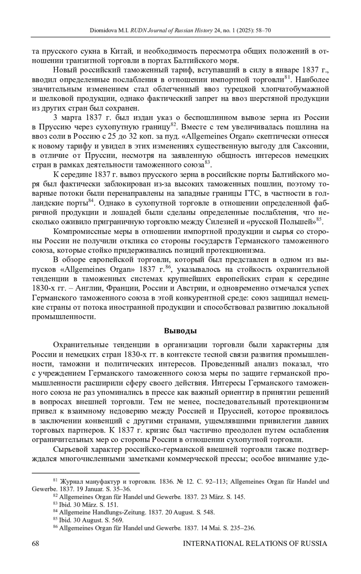 6. Коваленко М.И. Внешняя торговля России и германских государств в 1815-1837 гг.: анализ статистики импорта и экспорта // Экономическая история. 2021. Т. 17. № 1. С. 22-33. DOI: 10.15507/2409-630x.052.017.202101.022-033 EDN: HPTTNY