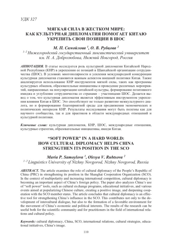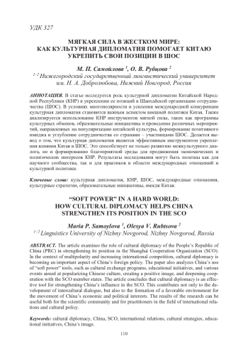 Использование культурной дипломатии в качестве мягкой силы становится одним из ключевых инструментов международного взаимодействия в условиях современного мира. Для КНР культурное сотрудничество с другими странами, особенно в рамках ШОС, приобретает особое значение. Страны – участницы ШОС, среди которых Россия, Индия, Казахстан и другие государства, представляют для Китая не только экономический, но и культурный интерес, который КНР активно стремится развивать. Данная статья направлена на анализ роли культурной дипломатии Китая в укреплении его позиций в ШОС. В работе будут рассмотрены конкретные примеры культурных проектов и инициатив, реализуемых КНР в рамках организации, а также оценено их влияние на экономическое, политическое и социальное сотрудничество.