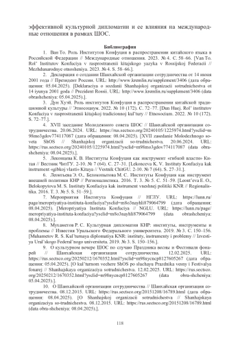 17. Ши Даньдань. Культурная дипломатия КНР в рамках ШОС (2001-2020 гг.) // Научные труды Республиканского института высшей школы. Исторические и психолого-педагогические науки. 2021. № 3 (21). С. 94-103. URL: https://elib.bsu.by/bitstream/123456789/272007/1/ШиДаньдань_НТ_21_Ч.3_v-094-103.pdf?ysclid=lu1qseltjk727065804 (дата обращения 08.04.2025).
