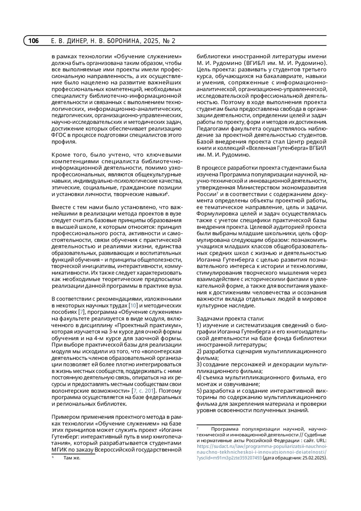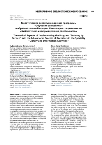 В статье проведен анализ теоретических и практических аспектов проблемы внедрения в процесс обучения бакалавров специальности «Библиотечноинформационная деятельность» технологии «Обучение служением», ставшей с 2024 г. обязательной образовательной программой в вузах страны. Актуальность исследования, представленного авторами, определяется неразработанностью инструментов внедрения этой технологии в образовательный процесс конкретного направления обучения в вузе.