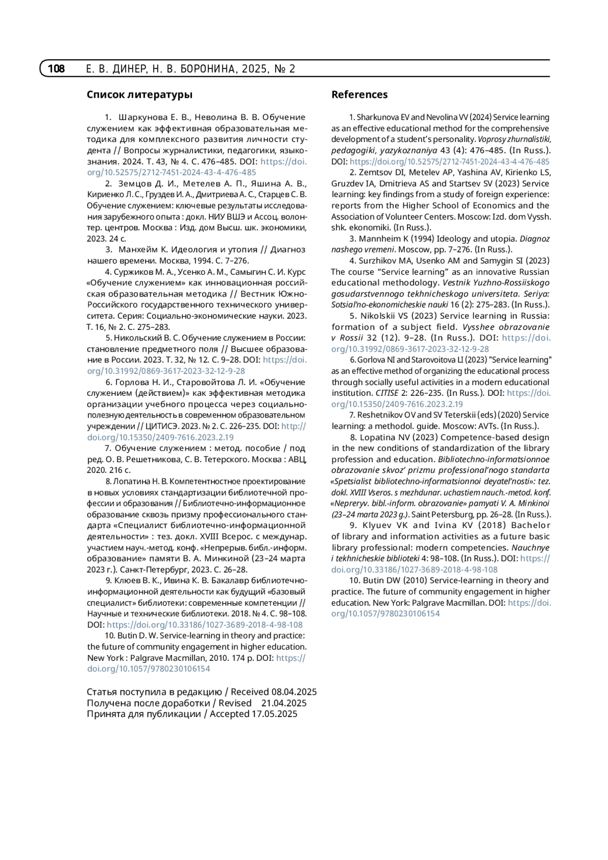 5. Никольский В. С. Обучение служением в России: становление предметного поля // Высшее образование в России. 2023. Т. 32, № 12. С. 9-28. https://doi.org/10.31992/0869-3617-2023-32-12-9-28