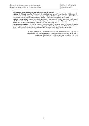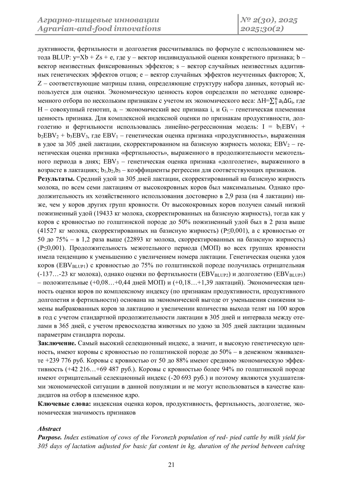 Материалы и методы. В оценке использовалась данные из ИАС «СЕЛЭКС. Молочный скот» по живым коровам красно-пестрой породы (7689 голов) из 15 племенных хозяйств Воронежской области 2008-2021 года рождения. Племенная ценность коров по признакам продуктивности, фертильности и долголетия рассчитывалась по формуле с использованием метода BLUP: y=Xb + Zs + e, где y - вектор индивидуальной оценки конкретного признака; b - вектор неизвестных фиксированных эффектов; s - вектор случайных неизвестных аддитивных генетических эффектов отцов; e - вектор случайных эффектов неучтенных факторов; X, Z - соответствующие матрицы плана, определяющие структуру набора данных, который используется для оценки. Экономическую ценность коров определяли по методике одновременного отбора по нескольким признакам с учетом их экономического веса: ∆Н=1naᵢ∆Gᵢ, где Н - совокупный генотип, aᵢ - экономический веc признака i, и Gi - генетическая племенная ценность признака. Для комплексной индексной оценки по признакам продуктивности, долголетию и фертильности использовалась линейно-регрессионная модель: I = b1EBV1 + b2EBV2 + b3EBV3, где EBV1 - генетическая оценка признака «продуктивность», выраженная в удое за 305 дней лактации, скорректированном на базисную жирность молока; EBV2 - генетическая оценка признака «фертильность», выраженного в продолжительности межотельного периода в днях; EBV3 - генетическая оценка признака «долголетие», выраженного в возрасте в лактациях; b1, b2, b3 - коэффициенты регрессии для соответствующих признаков.