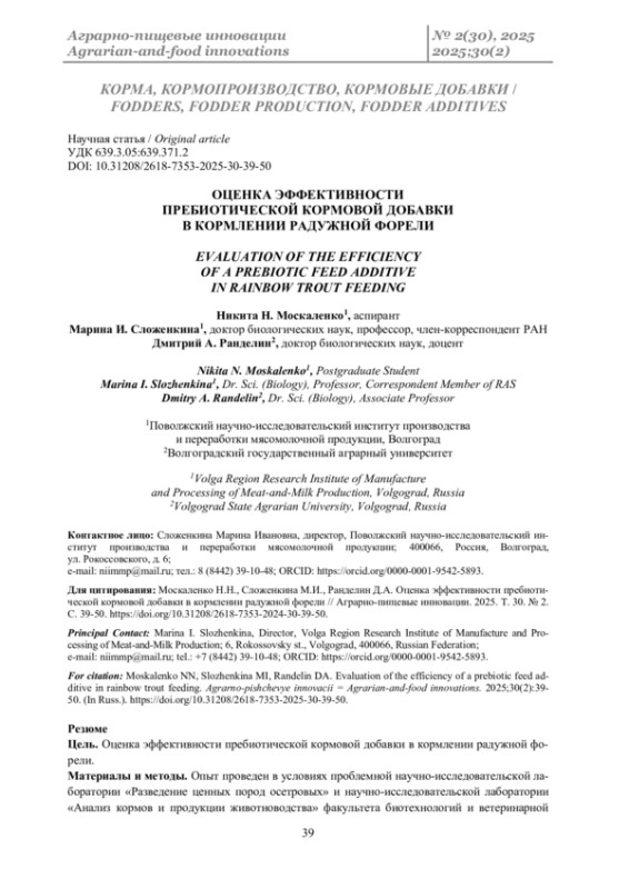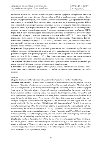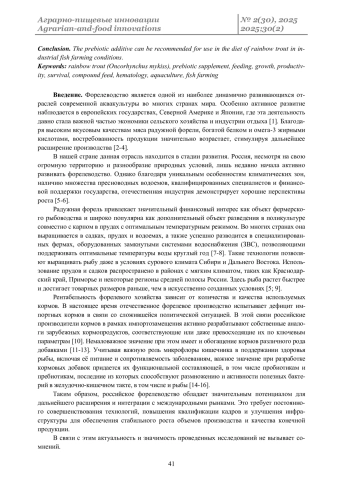 Заключение. Пребиотическая добавка может быть рекомендована для использования в рационе радужной форели в условиях промышленного рыбоводства.