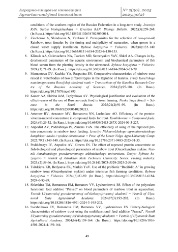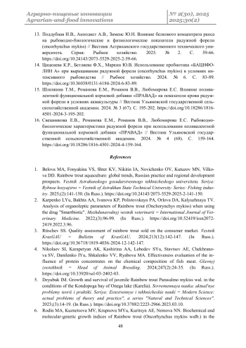 1. Белова М.А., Фонякина В.С., Штер К.В., Никитин И.А., Новиченко О.В., Кутузов М.Н., Вилкова Д.Д. Аквакультура радужной форели: мировые тенденции, российская практика и региональные перспективы развития // Вестник Астраханского государственного технического университета. Серия: Рыбное хозяйство. 2025. № 2. С. 141-150. DOI: 10.24143/2073-5529-2025-2-141-150