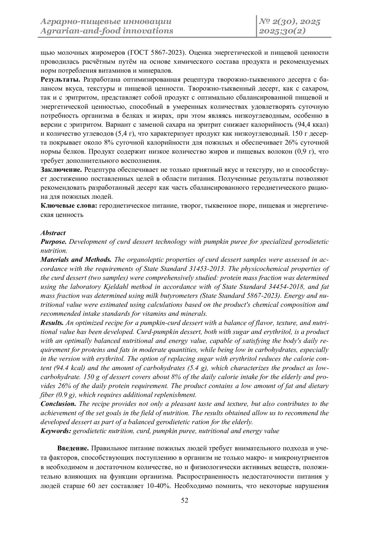 Результаты. Разработана оптимизированная рецептура творожно-тыквенного десерта с балансом вкуса, текстуры и пищевой ценности. Творожно-тыквенный десерт, как с сахаром, так и с эритритом, представляет собой продукт с оптимально сбалансированной пищевой и энергетической ценностью, способный в умеренных количествах удовлетворять суточную потребность организма в белках и жирах, при этом являясь низкоуглеводным, особенно в версии с эритритом. Вариант с заменой сахара на эритрит снижает калорийность (94,4 ккал) и количество углеводов (5,4 г), что характеризует продукт как низкоуглеводный. 150 г десерта покрывает около 8% суточной калорийности для пожилых и обеспечивает 26% суточной нормы белков. Продукт содержит низкое количество жиров и пищевых волокон (0,9 г), что требует дополнительного восполнения.