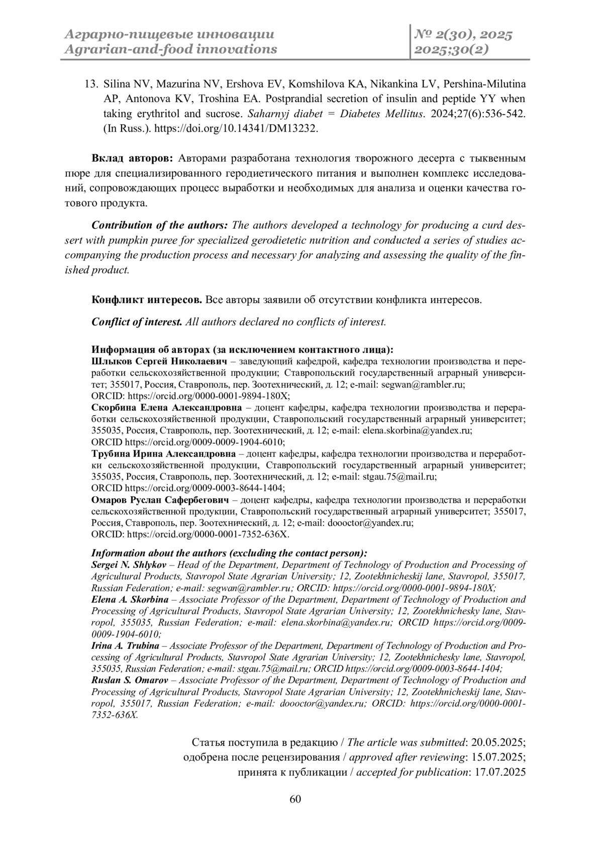 13. Силина Н.В., Мазурина Н.В., Ершова Е.В., и др. Постпрандиальная секреция инсулина и пептида YY при приеме эритритола и сахарозы // Сахарный диабет. 2024. Т. 27. № 6. С. 536-542.