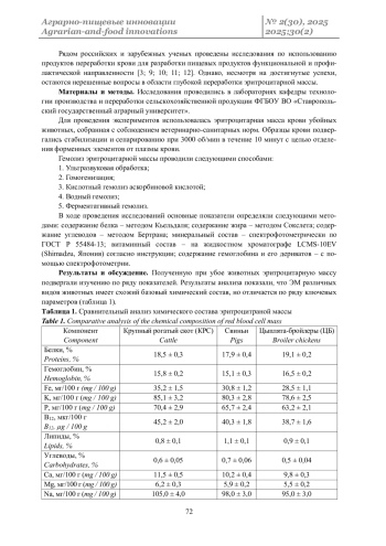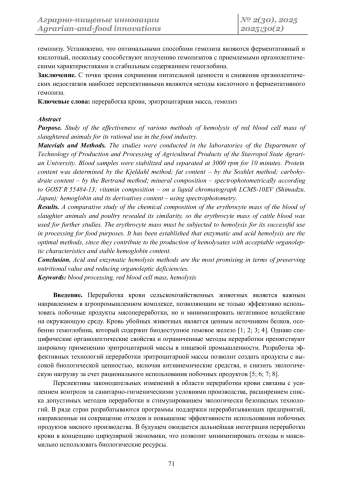 Переработка крови сельскохозяйственных животных является важным направлением в агропромышленном комплексе, позволяющим не только эффективно использовать побочные продукты мясопереработки, но и минимизировать негативное воздействие на окружающую среду. Кровь убойных животных является ценным источником белков, особенно гемоглобина, который содержит биодоступное гемовое железо [1; 2; 3; 4]. Однако специфические органолептические свойства и ограниченные методы переработки препятствуют широкому применению эритроцитарной массы в пищевой промышленности. Разработка эффективных технологий переработки эритроцитарной массы позволит создать продукты с высокой биологической ценностью, включая антианемические средства, и снизить экологическую нагрузку за счет рационального использования побочных продуктов [5; 6; 7; 8].