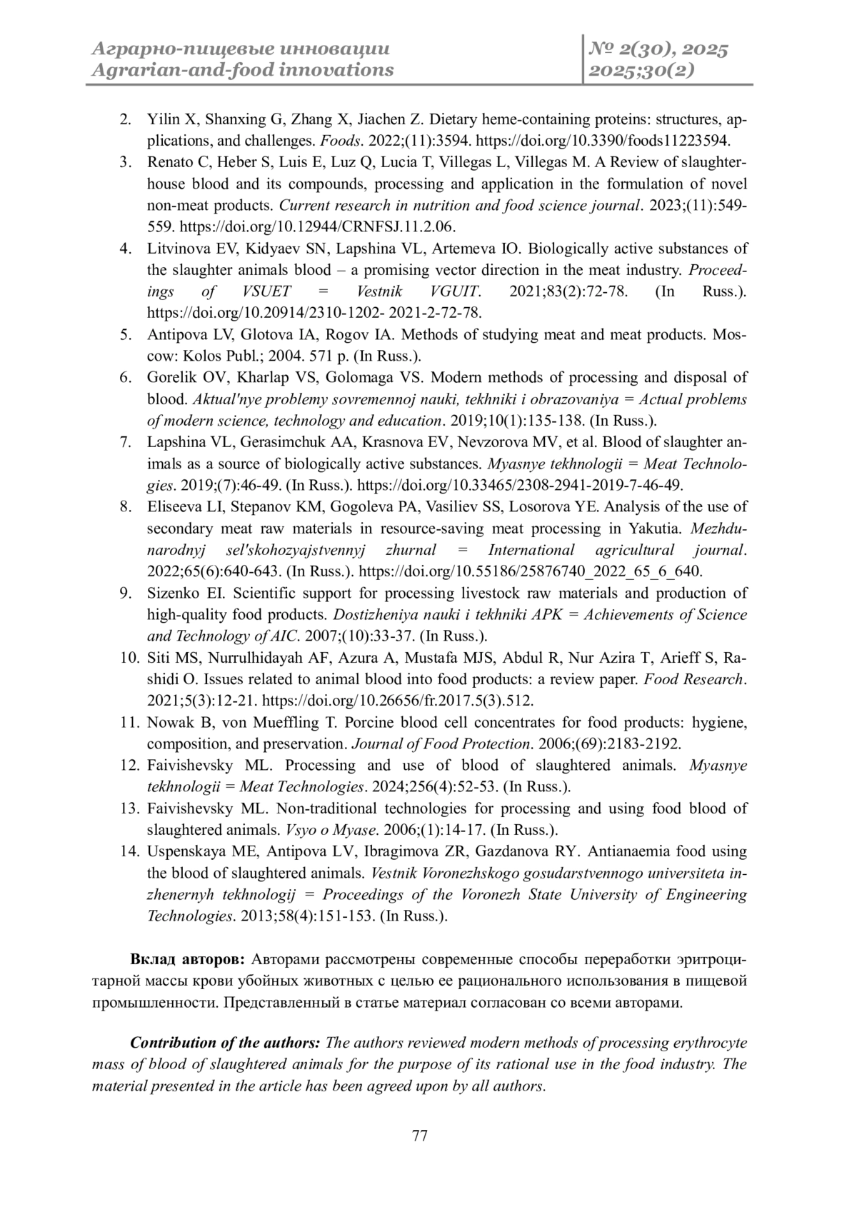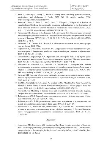 3. Renato C., Heber S., Luis E., Luz Q., Lucia T., Villegas L., Villegas M. A Review of slaughterhouse blood and its compounds, processing and application in the formulation of novel non-meat products // Current Research in Nutrition and Food Science Journal. 2023. Vol. 11. P. 549-559. DOI: 10.12944/CRNFSJ.11.2.06
