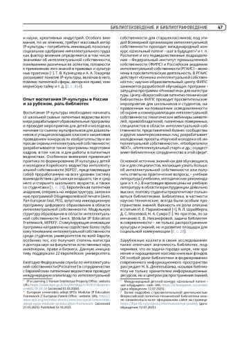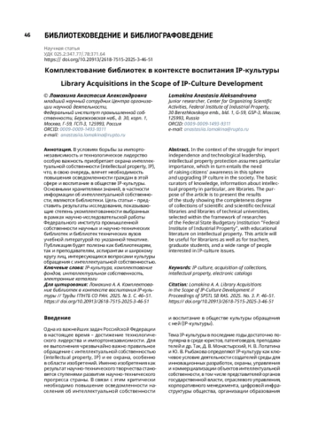 1. Монастырский Д. В., Лопатина Н. В., Рыбакова Ю. В. Модельная программа формирования IP-культуры библиотечных специалистов // Культура: теория и практика : электрон. науч. журн. 2022. Вып. 4. URL: http://theoryofculture.ru/issues/126/1555 (дата обращения: 21.03.2025).