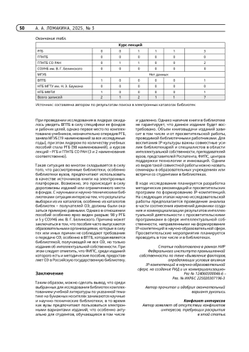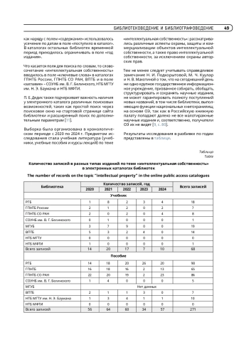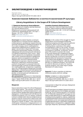 В условиях борьбы за импортонезависимость и технологическое лидерство особую важность приобретает охрана интеллектуальной собственности (intellectual property, IP), что, в свою очередь, влечет необходимость повышения осведомленности граждан в этой сфере и воспитание в обществе IP-культуры. Основными хранителями знаний, в частности информации об интеллектуальной собственности, являются библиотеки. Цель статьи – представить результаты исследования, показывающие степень укомплектованности выбранных в рамках научно-исследовательской работы Федерального института промышленной собственности научных и научно-технических библиотек и библиотек технических вузов учебной литературой по указанной тематике. Публикация будет полезна как библиотекарям, так и преподавателям, аспирантам и широкому кругу лиц, интересующихся вопросами культуры обращения с интеллектуальной собственностью.