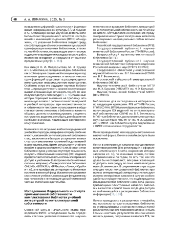 Библиотеки для исследования отбирались по следующим критериям. РГБ и ГПНТБ России, ГПНТБ СО РАН, ВПТБ были отобраны как библиотеки, получающие ОЭ изданий по интеллектуальной собственности; СОУНБ им. В. Г. Белинского, МГУБ – как библиотеки, расположенные в крупных научных центрах; НТБ МГТУ им. Н. Э. Баумана и НТБ МФТИ – как библиотеки вузов, подписавших с ФИПС соглашения о сотрудничестве.