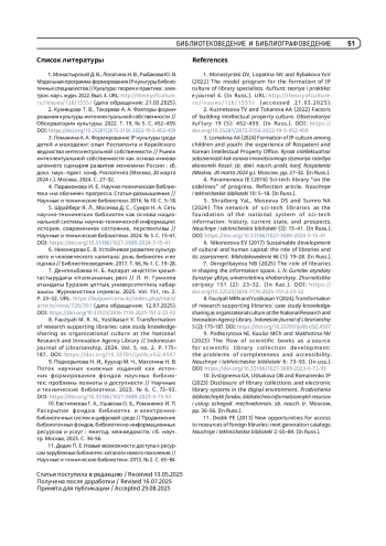 5. Шрайберг Я. Л., Мосеева Д. С., Сумро Н. А. Сеть научно-технических библиотек как основа национальной системы научно-технической информации: история, современное состояние, перспективы // Научные и технические библиотеки. 2024. № 3. С. 15-41. https://doi.org/10.33186/1027-3689-2024-3-15-41