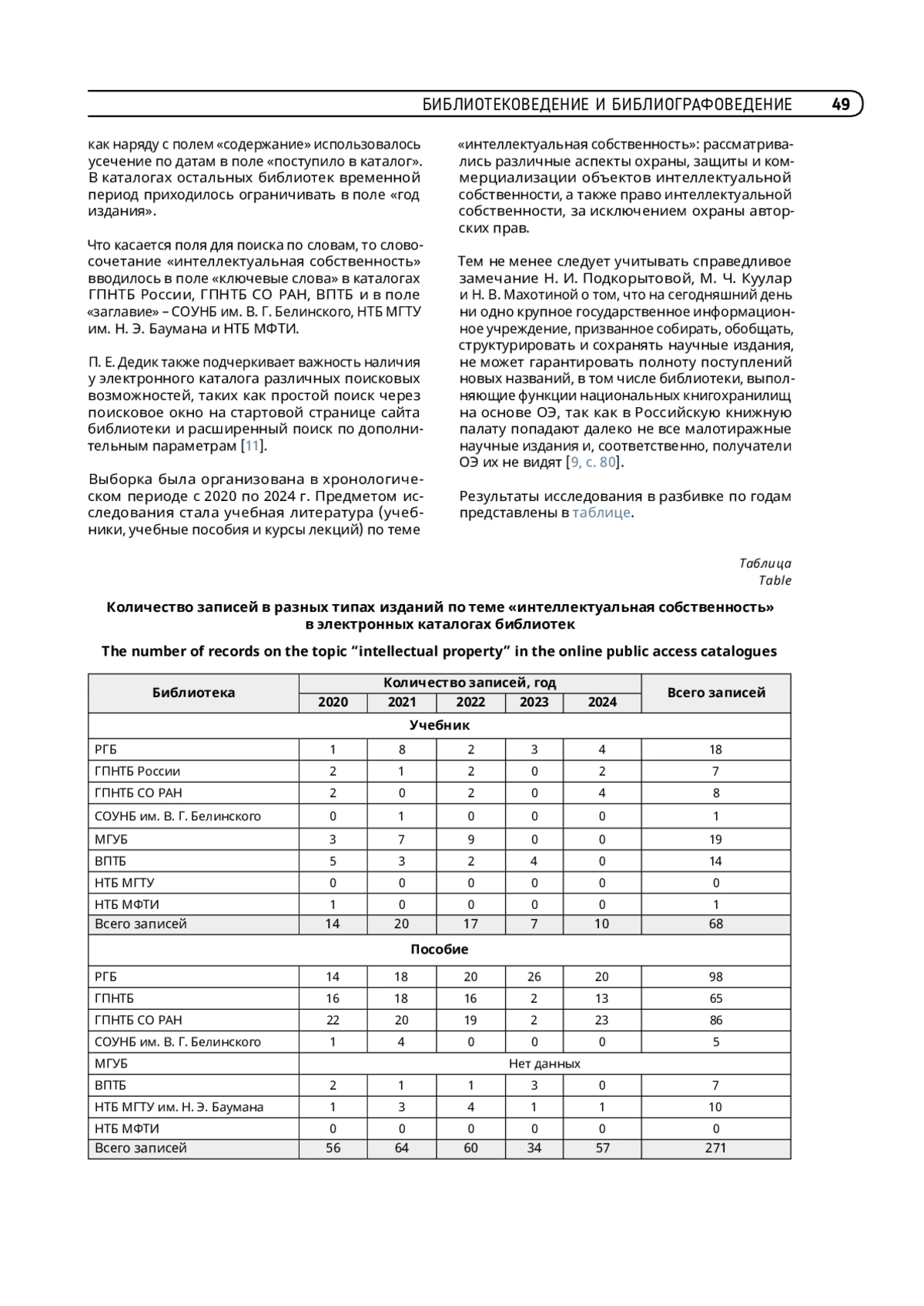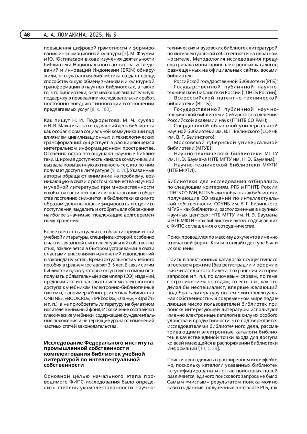 9. Подкорытова Н. И., Куулар М. Ч., Махотина Н. В. Поток научных книжных изданий как источник формирования фондов научных библиотек: проблемы полноты и доступности // Научные и технические библиотеки. 2023. № 6. С. 73-93. https://doi.org/10.33186/1027-3689-2023-6-73-93