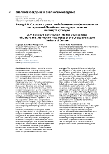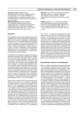 Представитель Санкт-Петербургского государственного института культуры Аркадий Васильевич Соколов, крупнейший и авторитетнейший ученый в системе наук документно-коммуникационного цикла, на протяжении многих лет сотрудничал со специалистами Челябинского государственного института культуры. Исследование принципов и направлений его сотрудничества с различными учреждениями, влияния на специалистов информационной сферы, научного наследия позволяет зафиксировать образцовую коммуникативную практику для трансляции опыта работы.