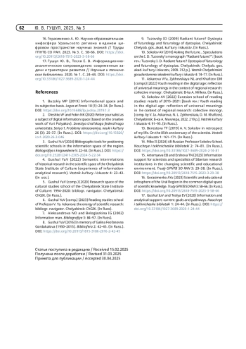 3. Гушул Ю. В. Библиографические инструменты позиционирования научных школ в информационном пространстве региона // Библио-графия и книговедение. 2024. № 5. С. 22-34. https://doi.org/10.25281/2411-2305-2024-5-22-34