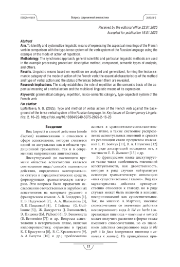 Результаты: проанализированы и обобщены языковые средства на основе повтора, формируемые лексико-семантическую категорию способа действия французского глагола; выявлены сущностные характеристики способа и вида глагольного действия и статусные различия между ними.