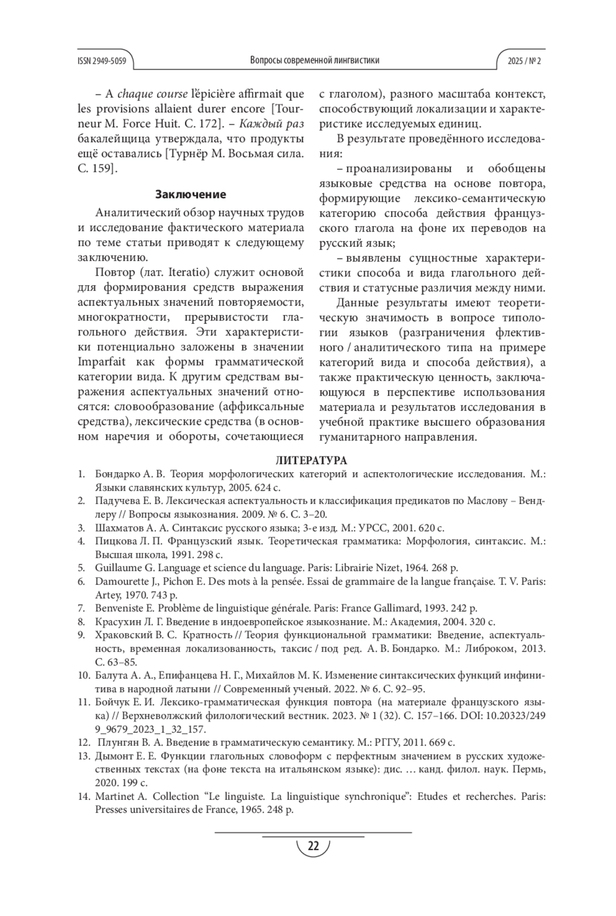 11. Бойчук Е. И. Лексико-грамматическая функция повтора (на материале французского языка) // Верхневолжский филологический вестник. 2023. № 1 (32). С. 157-166. DOI: 10.20323/2499_9679_2023_1_32_157 EDN: YFJXPM