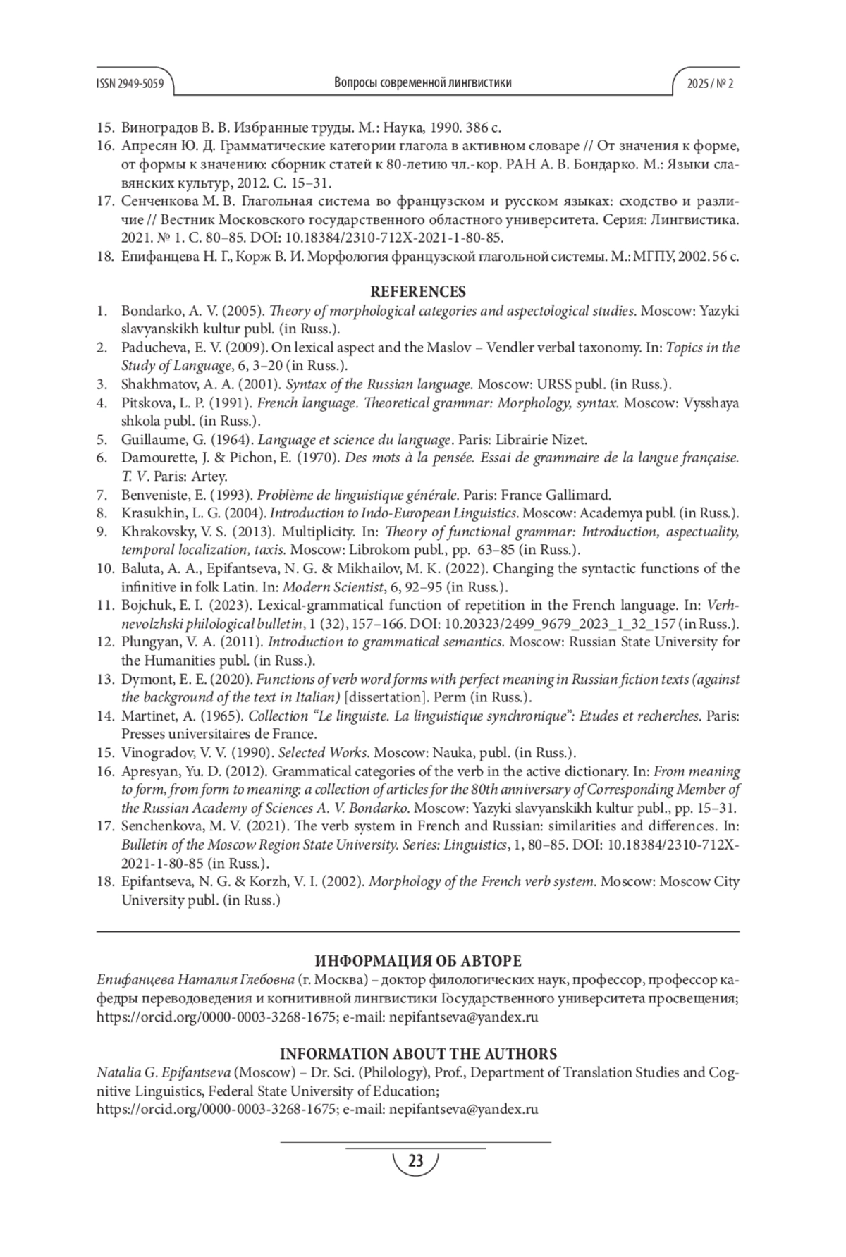 17. Сенченкова М. В. Глагольная система во французском и русском языках: сходство и различие // Вестник Московского государственного областного университета. Серия: Лингвистика. 2021. № 1. С. 80-85. DOI: 10.18384/2310-712X-2021-1-80-85 EDN: PCSMMW