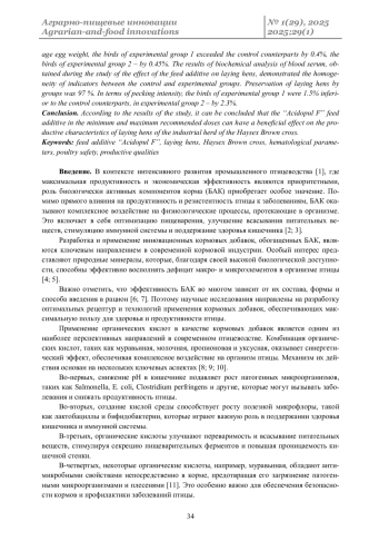 В контексте интенсивного развития промышленного птицеводства [1], где максимальная продуктивность и экономическая эффективность являются приоритетными, роль биологически активных компонентов корма (БАК) приобретает особое значение. Помимо прямого влияния на продуктивность и резистентность птицы к заболеваниям, БАК оказывают комплексное воздействие на физиологические процессы, протекающие в организме. Это включает в себя оптимизацию пищеварения, улучшение всасывания питательных веществ, стимуляцию иммунной системы и поддержание здоровья кишечника [2; 3].