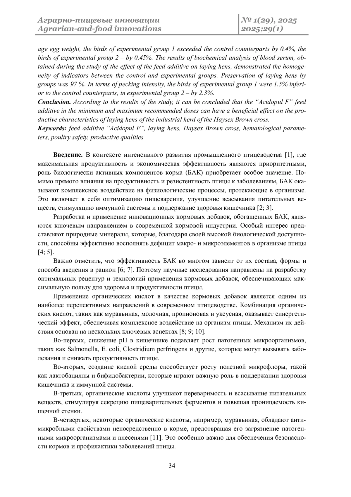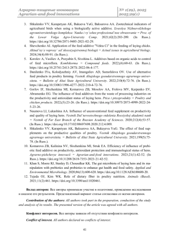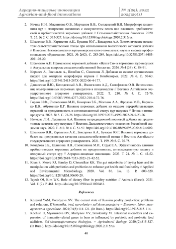 10. Комарова З.Б., Калинина Н.В., Сложенкина М.И., Струк Е.А. Эффективность влияния пребиотических кормовых добавок на продуктивность, антиоксидантную защиту и иммунный статус кур // Аграрно-пищевые инновации. 2023. Т. 21. № 1. С. 42-52. DOI: 10.31208/2618-7353-2023-21-42-52