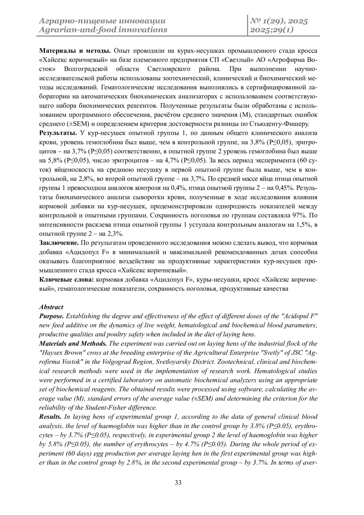 Материалы и методы. Опыт проводили на курах-несушках промышленного стада кросса «Хайсекс коричневый» на базе племенного предприятия СП «Светлый» АО «Агрофирма Восток» Волгоградской области Светлоярского района. При выполнении научно-исследовательской работы использованы зоотехнический, клинический и биохимический методы исследований. Гематологические исследования выполнялись в сертифицированной лаборатории на автоматических биохимических анализаторах с использованием соответствующего набора биохимических реагентов. Полученные результаты были обработаны с использованием программного обеспечения, расчётом среднего значения (М), стандартных ошибок среднего (±SEM) и определением критерия достоверности разницы по Стьюденту-Фишеру.