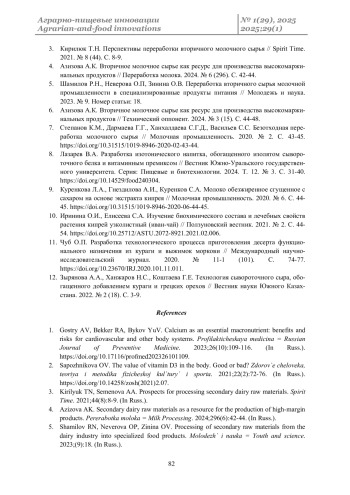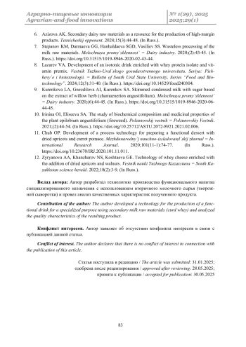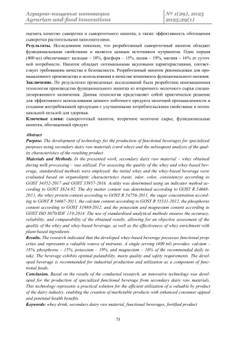 Заключение. По результатам проведенных исследований была разработана инновационная технология производства функционального напитка из вторичного молочного сырья специализированного назначения. Данная технология представляет собой практическое решение для эффективного использования ценного побочного продукта молочной промышленности и создания востребованной продукции с улучшенными потребительскими свойствами и потенциальной пользой для здоровья.