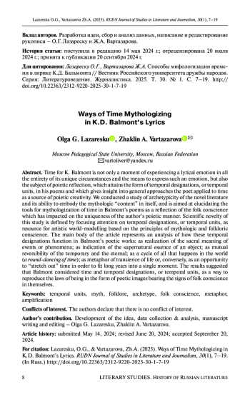 Главная цель - рассмотреть приемы мифологизации времени в стихотворных произведениях Бальмонта, показать, как в них отражается народное сознание, как народное творчество влияет на уникальность авторской поэтической манеры. Изучается, как у Бальмонта функционируют временные обозначения: реализация сакрального смысла событий или явлений; указание на сверхъестественную природу объекта; взаимообратимость временного и вечного; круговорот всего происходящего в мире («хороводность времен»); метафора быстротечности жизни или, наоборот, возможность «растянуть» время, чтобы в одно мгновенье вместить долгие годы. Полученные результаты показали, что Бальмонт рассматривал время, временные обозначения, темпоральные единицы как способ воспроизведения законов бытия в поэтических образах, несущих приметы народного сознания.