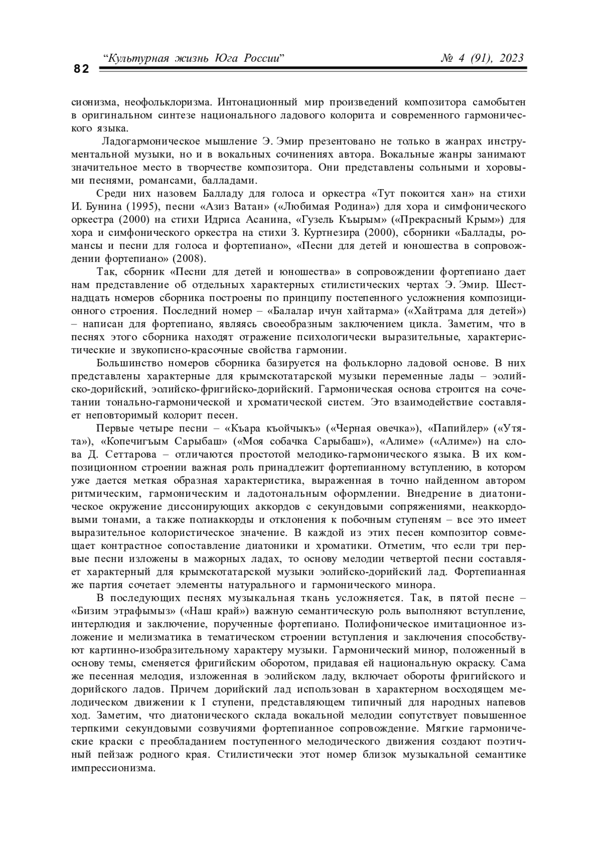 Э. Эмир – современный крымскотатарский композитор, в творчестве которого аккумулируются специфические приметы художественного мышления, как предшествующих эпох, так и XX века. Общеизвестно, что взаимодействие традиционного и инновационного в музыкальном искусстве второй половины XX века приводит к «множественности техник современного композиторского творчества» [8. С. 9]. При этом гармония, как компонент стилевой системы, также обновляется, включая в себя аккорды нетерцового строения и теряя тонально-функциональные связи