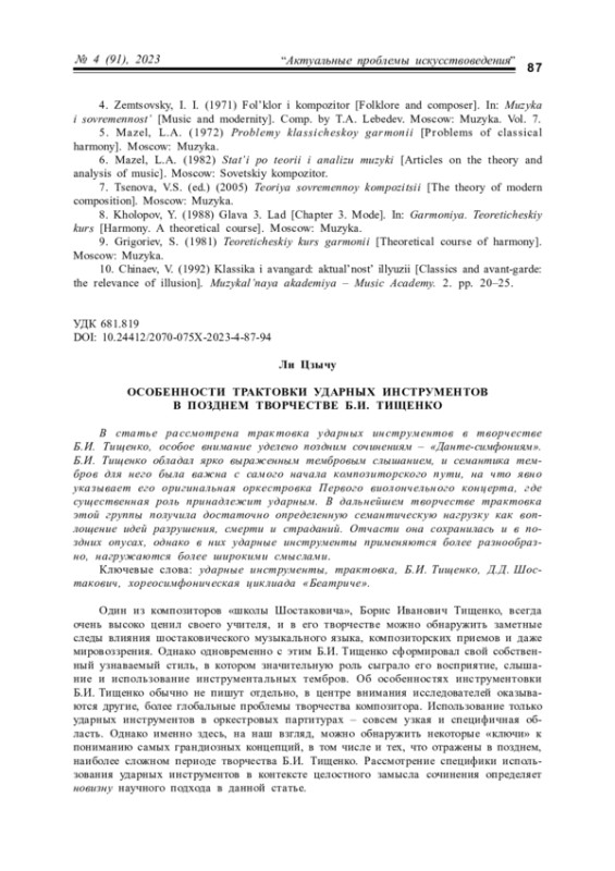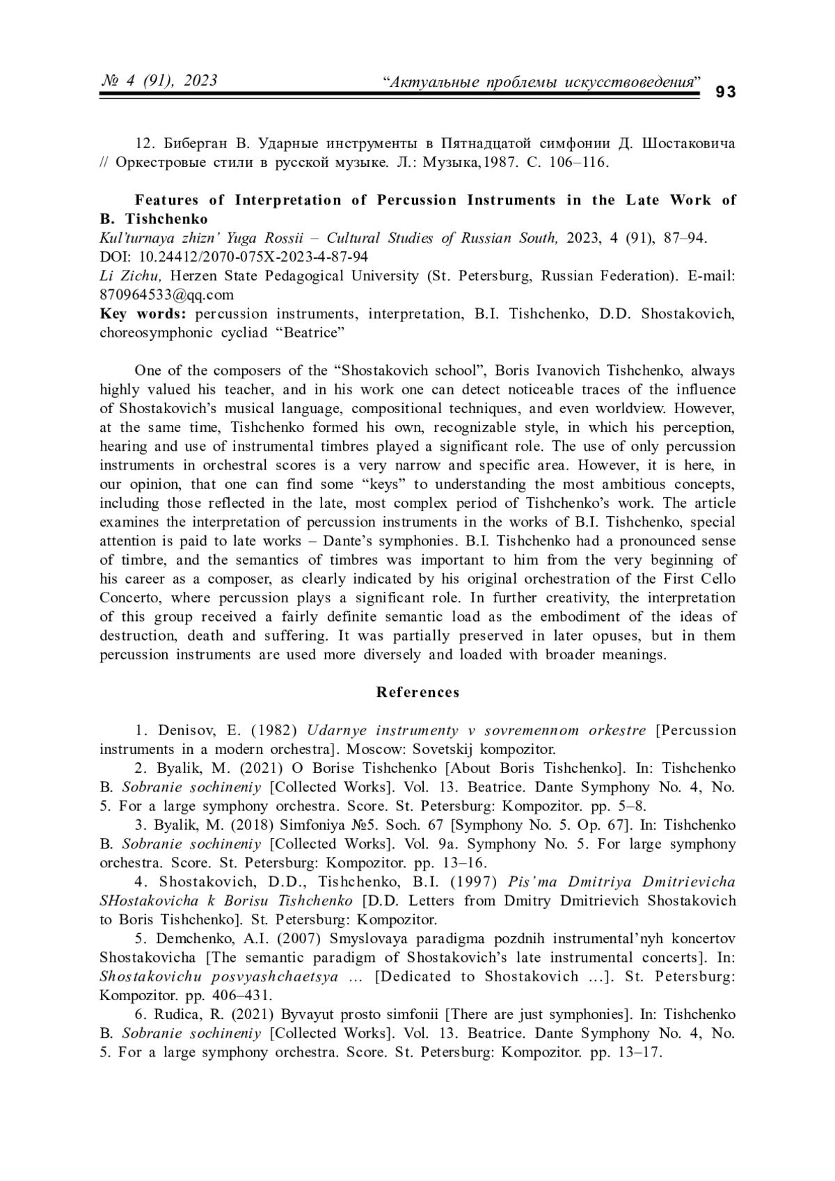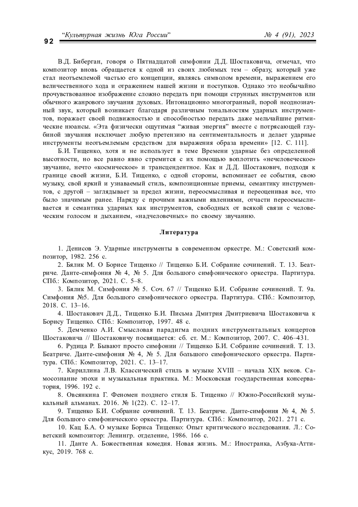 12. Биберган В. Ударные инструменты в Пятнадцатой симфонии Д. Шостаковича // Оркестровые стили в русской музыке. Л.: Myзыка,1987. C. 106-116.