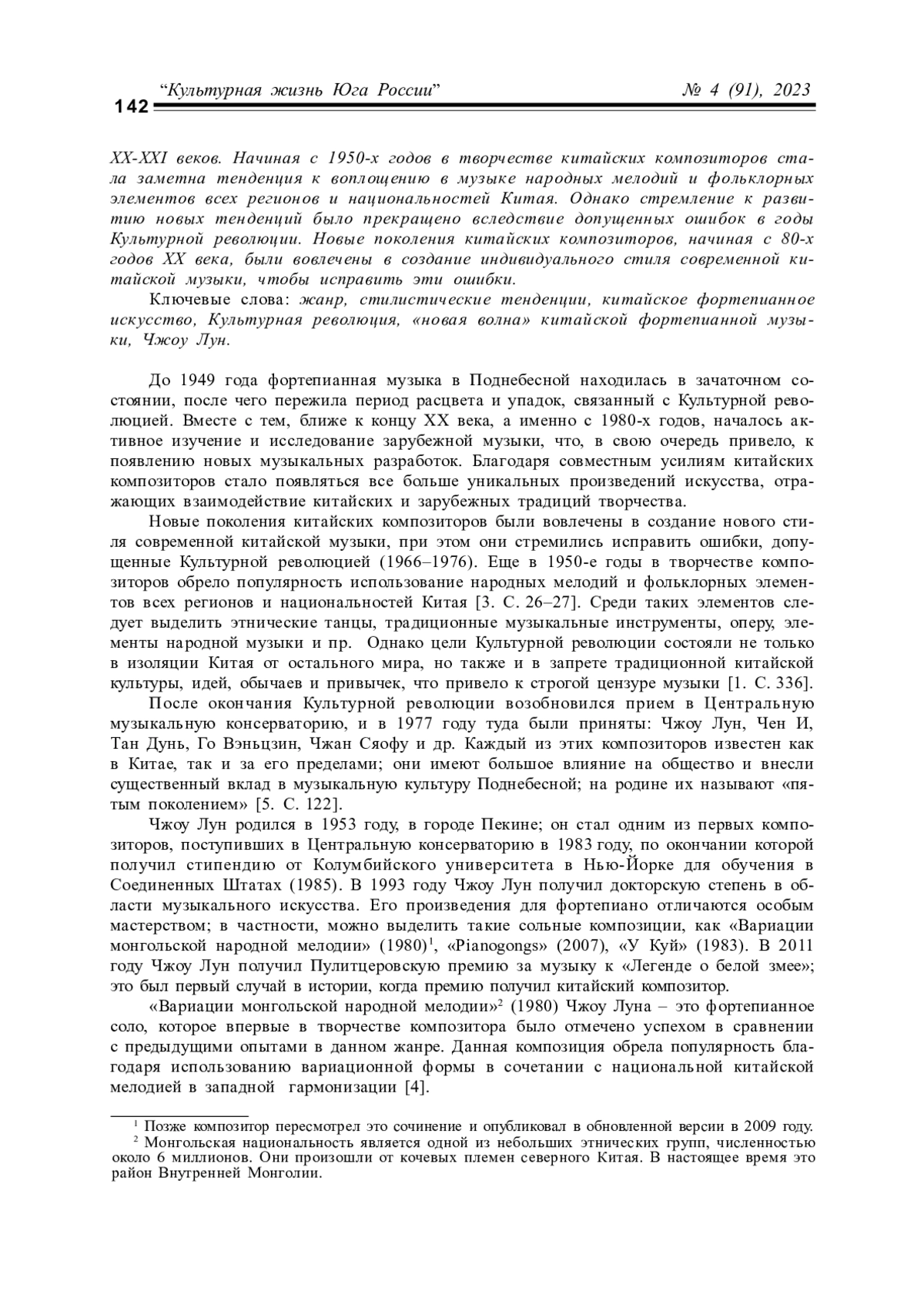 В рамках статьи осуществляется анализ творчества Чжоу Луна в контексте обновления жанровой стилистики фортепианной музыки Китая рубежа XX-XXI веков. Начиная с 1950-х годов в творчестве китайских композиторов стала заметна тенденция к воплощению в музыке народных мелодий и фольклорных элементов всех регионов и национальностей Китая. Однако стремление к развитию новых тенденций было прекращено вследствие допущенных ошибок в годы Культурной революции. Новые поколения китайских композиторов, начиная с 80-х годов XX века, были вовлечены в создание индивидуального стиля современной китайской музыки, чтобы исправить эти ошибки