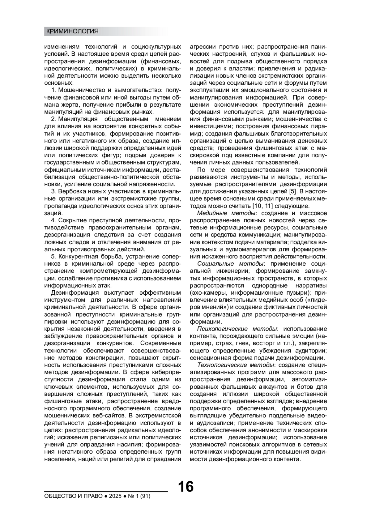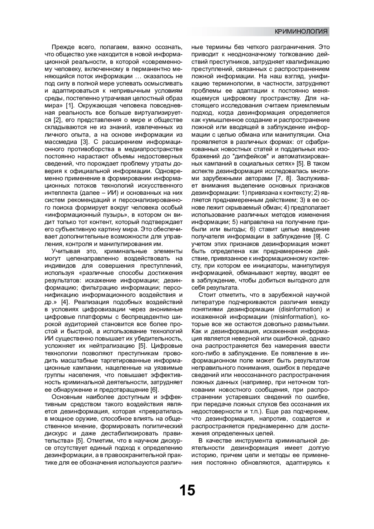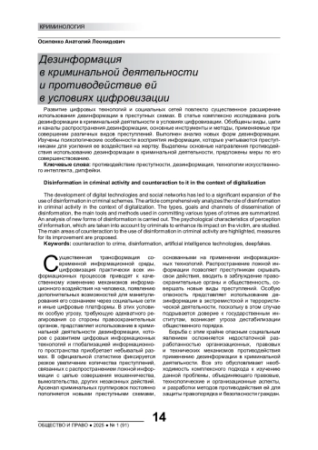 Развитие цифровых технологий и социальных сетей повлекло существенное расширение использования дезинформации в преступных схемах. В статье комплексно исследована роль дезинформации в криминальной деятельности в условиях цифровизации. Обобщены виды, цели и каналы распространения дезинформации, основные инструменты и методы, применяемые при совершении различных видов преступлений. Выполнен анализ новых форм дезинформации. Изучены психологические особенности восприятия информации, которые учитываются преступниками для усиления ее воздействия на жертву. Выделены основные направления противодействия использованию дезинформации в криминальной деятельности, предложены меры по его совершенствованию