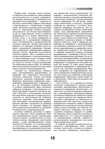 Существенная трансформация современной информационной среды, цифровизация практически всех информационных процессов приводят к качественному изменению механизмов информационного воздействия на человека, появлению дополнительных возможностей для манипулирования его сознанием через социальные сети и иные цифровые платформы. В этих условиях особую угрозу, требующую адекватного реагирования со стороны правоохранительных органов, представляет использование в криминальной деятельности дезинформации, которое с развитием цифровых информационных технологий и глобализацией информационного пространства приобретает небывалый размах