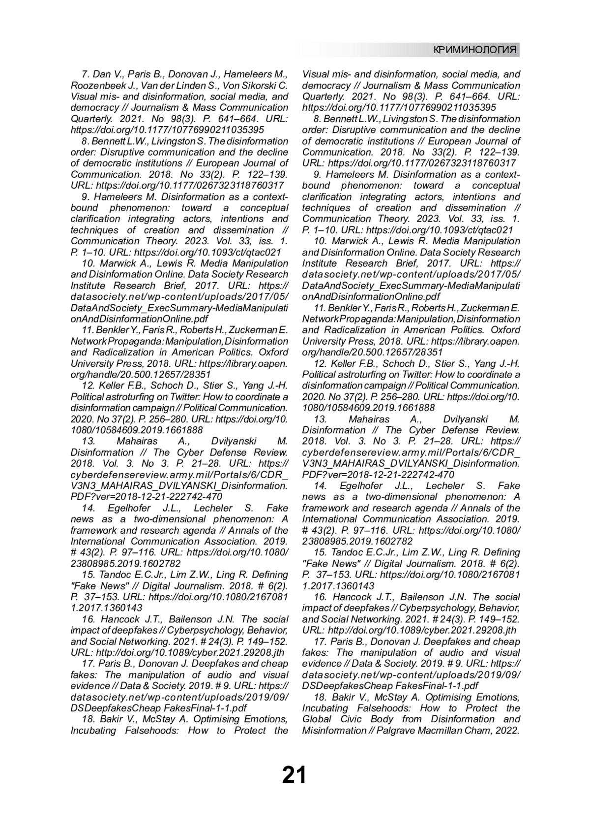 8. Bennett L.W., Livingston S. The disinformation order: Disruptive communication and the decline of democratic institutions // European Journal of Communication. 2018. No 33(2). P. 122-139. DOI: 10.1177/0267323118760317
