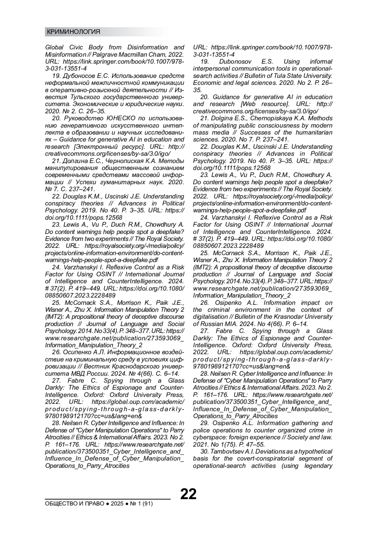 24. Varzhanskyi I. Reflexive Control as a Risk Factor for Using OSINT // International Journal of Intelligence and CounterIntelligence. 2024. # 37(2). P. 419-449. DOI: 10.1080/08850607.2023.2228489 EDN: JVLXOE
