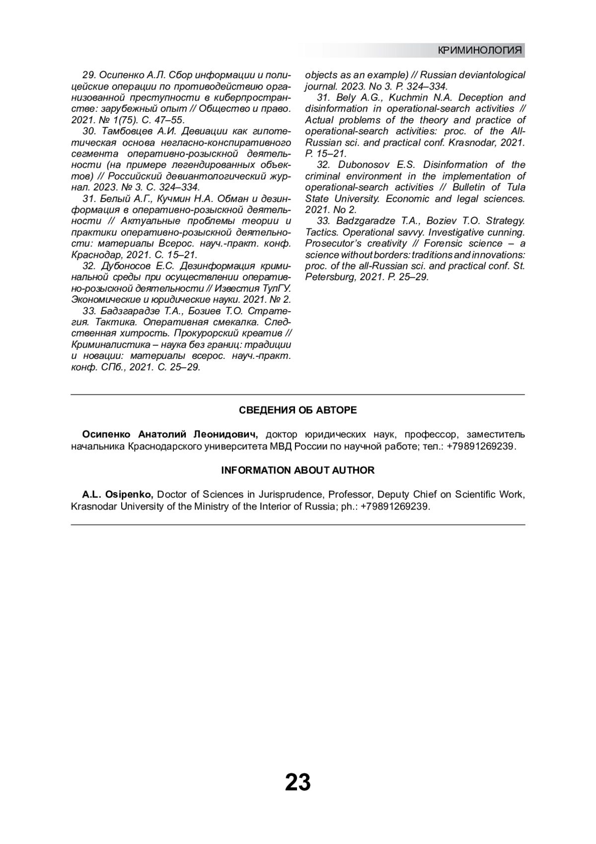 29. Осипенко А.Л. Сбор информации и полицейские операции по противодействию организованной преступности в киберпространстве: зарубежный опыт // Общество и право. 2021. № 1(75). С. 47-55. EDN: HXVVHN