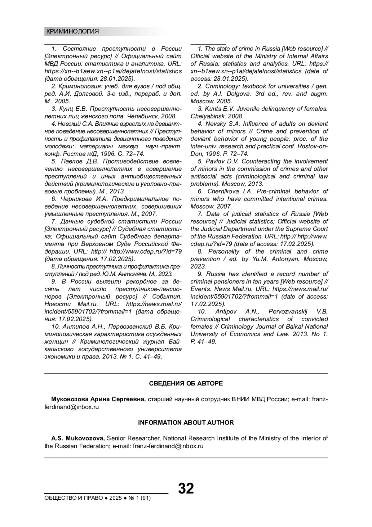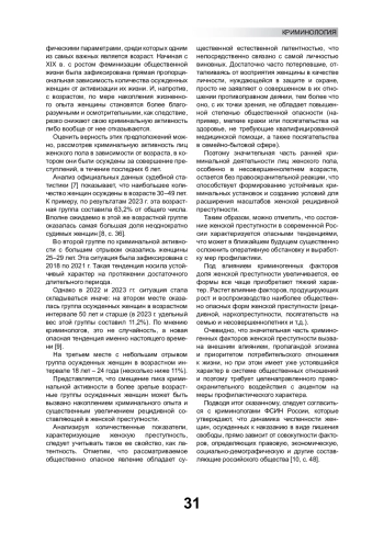 10. Антипов А.Н., Первозванский В.Б. Криминологическая характеристика осужденных женщин // Криминологический журнал Байкальского государственного университета экономики и права. 2013. № 1. С. 41-49.