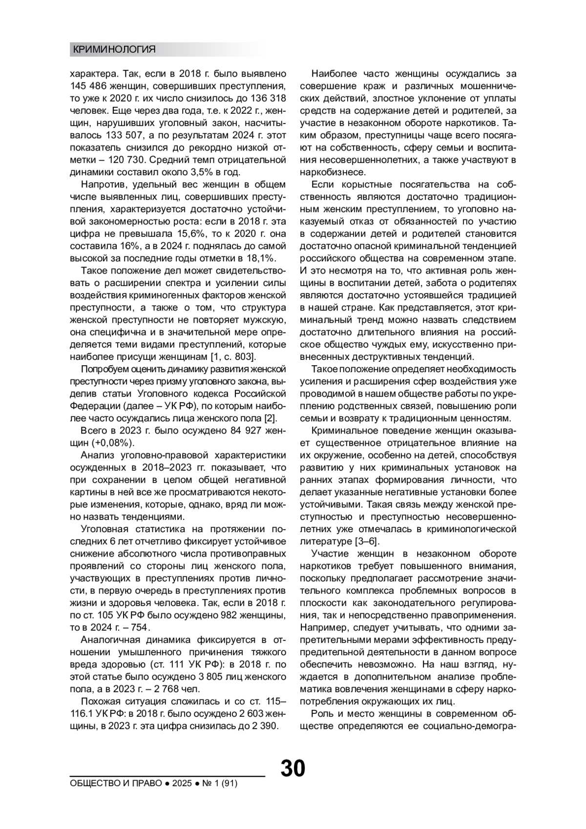 В настоящей статье при рассмотрении вопросов женской преступности предлагается применить методы криминологии с учетом социально-экономических и гендерных аспектов