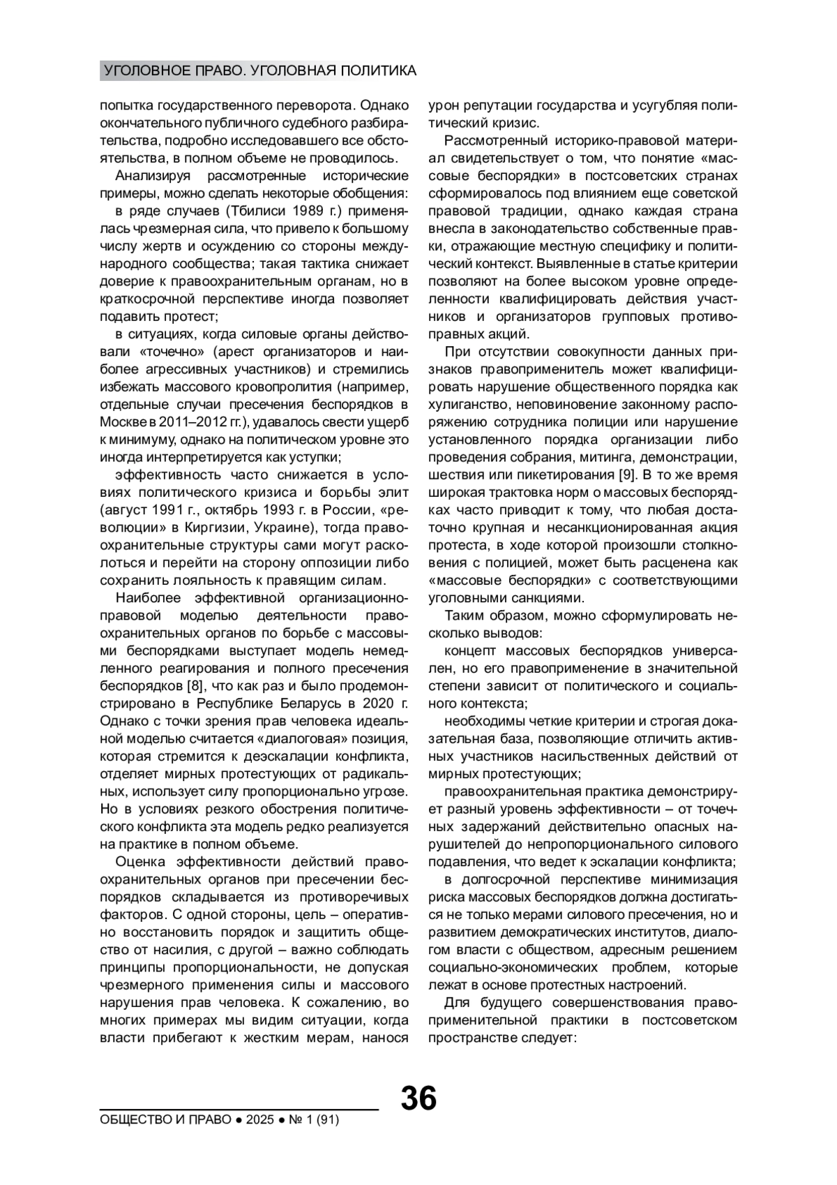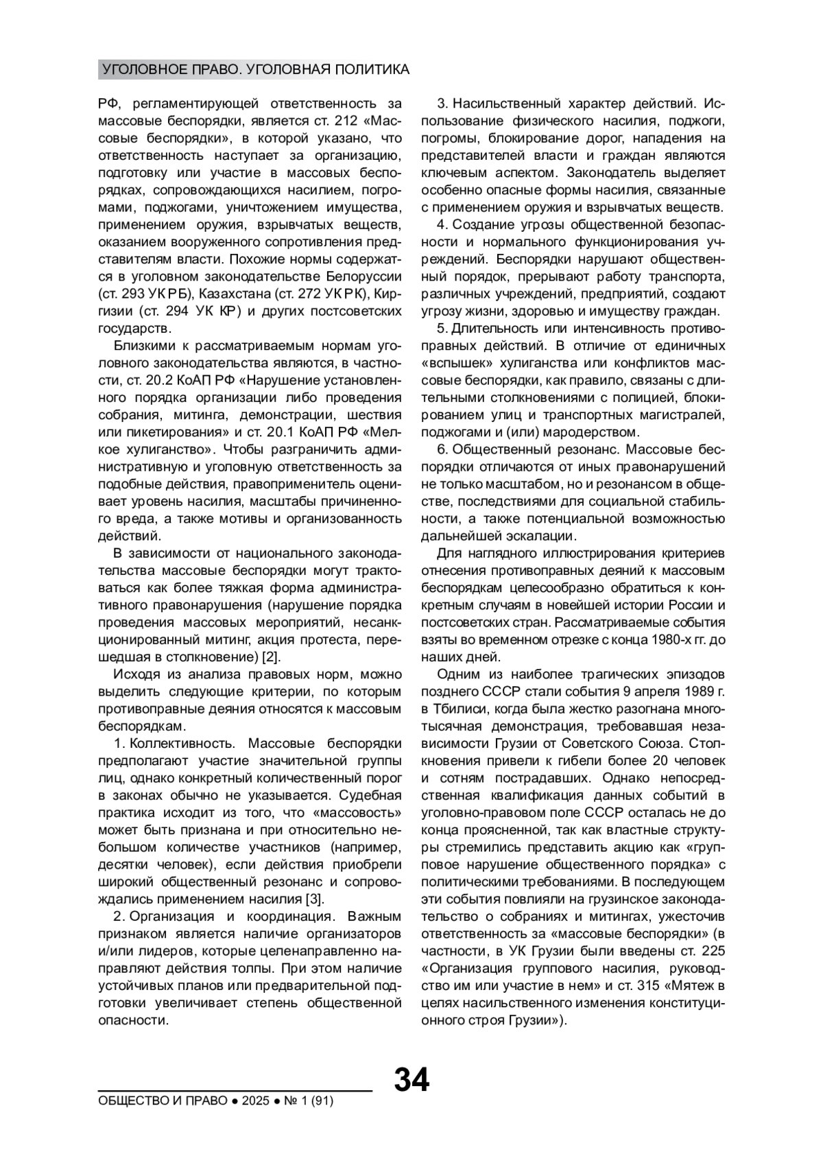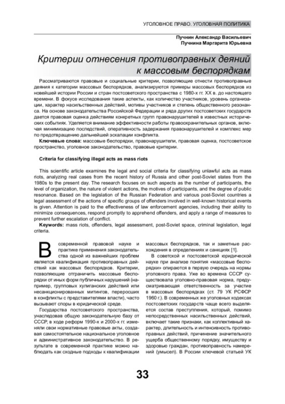 Рассматриваются правовые и социальные критерии, позволяющие отнести противоправные деяния к категории массовых беспорядков, анализируются примеры массовых беспорядков из новейшей истории России и стран постсоветского пространства с 1980-х гг. XX в. до настоящего времени. В фокусе исследования такие аспекты, как количество участников, уровень организации, характер насильственных действий, мотивы участников и степень общественного резонанса. На основе законодательства Российской Федерации и ряда других постсоветских государств дается правовая оценка действиям конкретных групп правонарушителей в известных исторических событиях. Уделяется внимание эффективности работы правоохранительных органов, включая минимизацию последствий, оперативность задержания правонарушителей и комплекс мер по предотвращению дальнейшей эскалации конфликта